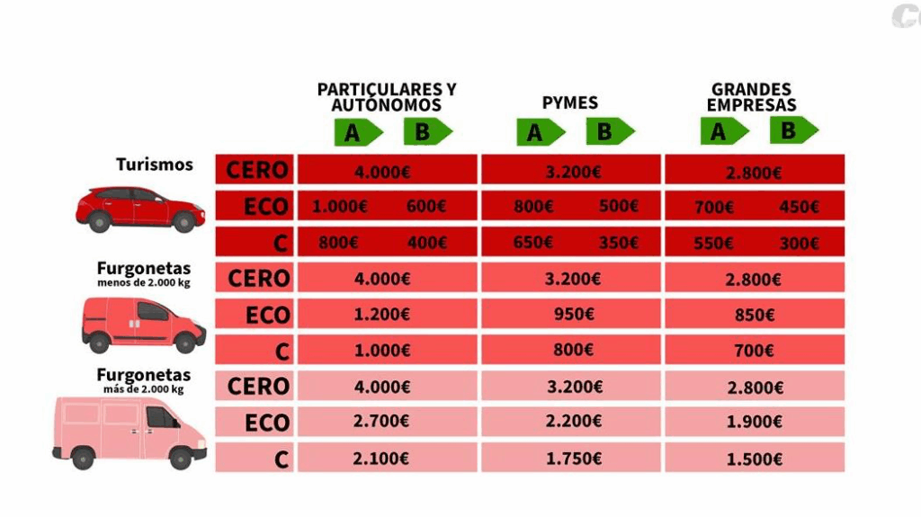 Etiqueta ambiental: En España se usan las etiquetas de la DGT (Cero, ECO, C, B). Las ayudas y descuentos más generosos suelen reservarse para los vehículos etiqueta Cero o ECO.
